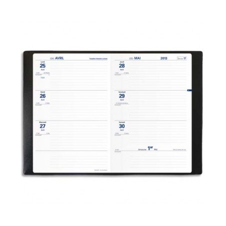 Format 16 x 24 cm. 1 semaine sur 2 pages de septembre à août. Couverture plastique grainée noire. Texthebdo.