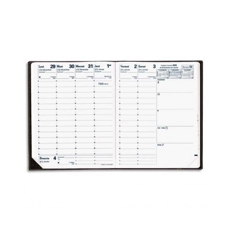 1 semaine sur 2 pages. Décembre à décembre : 13 mois. Couverture plastique grainée noire. Direction.