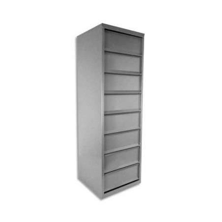 Corps en acier soudé par points. 8 cases. Ouverture totale des cases, fixation possible des meubles entre eux. Fermeture par aimant, préhension sur toute la largeur de la porte. Fixation au mur prévue pour une meilleure sécurité (vis non fournies). Pour le classement à plat.