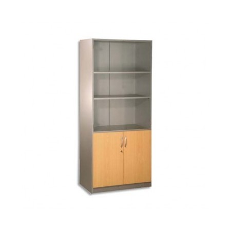 SIMMOB Bibliothèque haute H180 x L80 cm, 2 portes basses alu/hêtre ouverte gamme ALU HETRE BUDGET