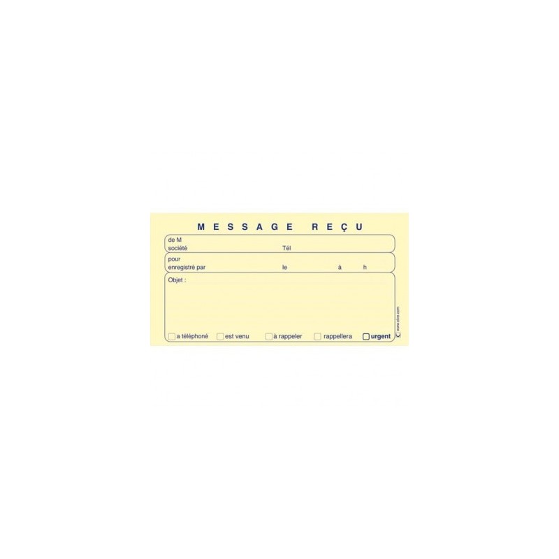 Couverture 350 g brillante. Carnets de communication avec rubriques pré-imprimées permettant la prise de rendez-vous, la communication d'information et de messages. 1 MESSAGES REÇUS : non repositionnables Format du carnet : 31,2 x 15 cm. Papier autocopiant avec l'original détachable pour remise au destinataire. Le double reste sur la souche. Permet de laisser 160 messages. Format du coupon : 140 x 75 mm. Facilite la communication et l’organisation professionnelles !