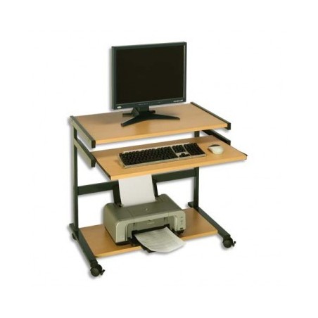Plateau panneaux de particules épaisseur 19 mm. Revêtement mélaminé hêtre. 4 roulettes dont 2 avec frein. Plateau supérieur confortable pour l’écran : (l x p) 80 x 50 cm. Tablette coulissante pour clavier et souris. Plateau inférieur pour UC verticale et imprimante. Dimensions (l x h x p) : 80 x 76 x 50 cm. Livré prêt à monter. Le 1er prix.