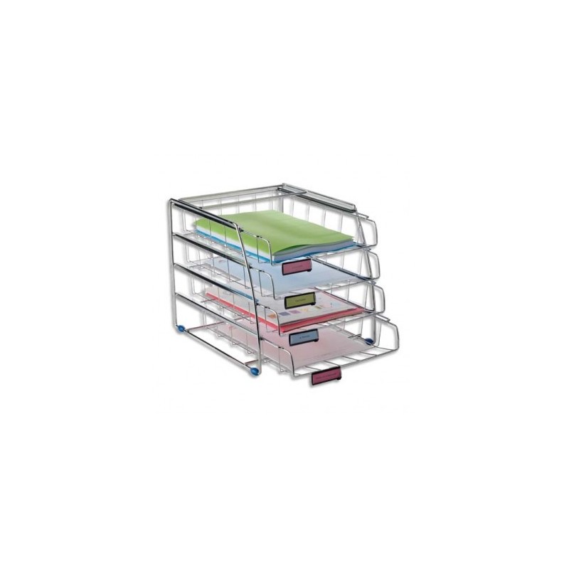En fil d’acier chromé. Indexation par porte-étiquette. Corbeilles coulissantes. Patins anti-dérapant. Pour document format 24 x 32 cm. Trieur 4 corbeilles à la française.