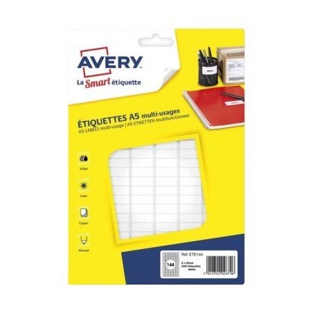 AVERY Sachet de 2304 étiquettes multi-usage blanches 8 x 20 mm. Planche format A5. ETE144