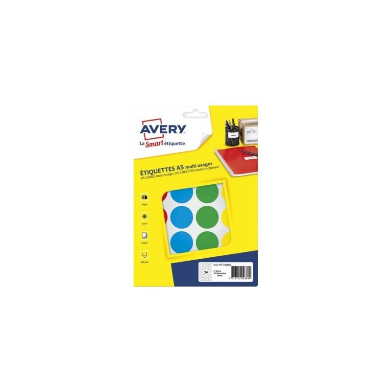 AVERY Sachet de 168 pastilles Ø30 mm. Imprimables. Coloris assortis