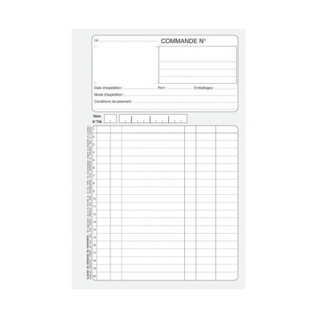Couverture en carton 350 g/m2 brillant 2 faces. Format 14 x 21 cm. Numérotage des feuillets de 1 à 50. Encrage bleu pour 1er feuillet, rouge pour le feuillet intermédiaire et vert pour le dernier feuillet. 1er feuillet et intermédiaire détachable. Intercalaire détachable au début du carnet. Dessous carton rigide 400 g/m2, dos toilé. Pour émettre vos bons de commande, de livraison ou vos factures...