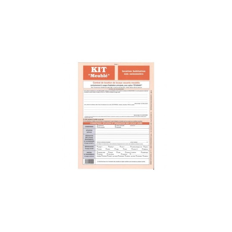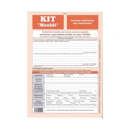 Contrat de location de locaux vacants meublés à usage d’habitation principale avec option « étudiant » (durée réduite à 9 mois), soumis au Titre 1er bis de la loi du 6 juillet 1989 et modifiée par la loi ALUR du 24 mars 2014. Contient : 1 contrat de location, 1 état des lieux simple d’entrée et de sortie, 1 inventaire des meubles et objets mobiliers, 1 acte de caution solidaire (8 pages). Obligation de joindre la notice d’information du locataire, référence 214658. Contrat de location meublé.