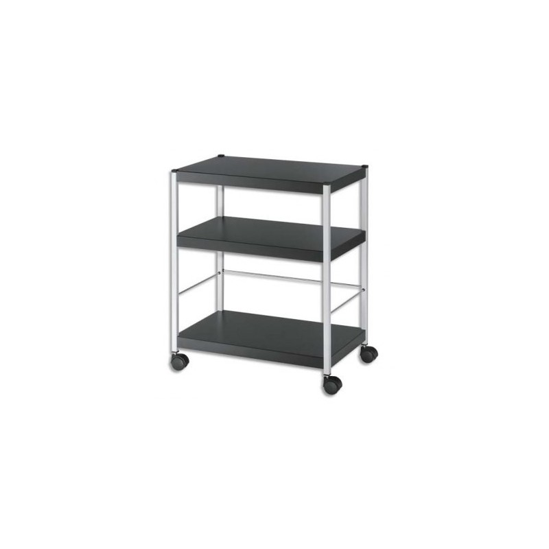 Table polyvalente 3 plateaux en métal laqué noir. Equipée de replis pour recevoir des dossiers suspendus. Tubes en métal laqué epoxy coloris aluminium. Charge utile jusque 35 kg par plateau. 4 roulettes multi-directionnelles. Livrée à plat. Très utile.