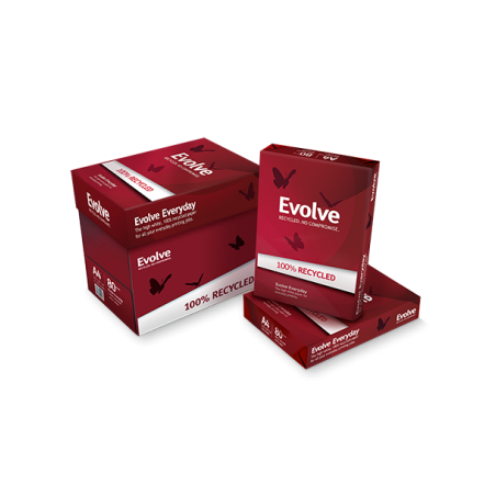 Ramette de 500 feuilles de papier blanc Evolve Everyday. 100 % recyclé. Permet des impressions quotidiennes de haute qualité sur du papier blanc, lisse d’une forte opacité. Emballage à partir de fibres recyclées. Format A4, 80 grammes.