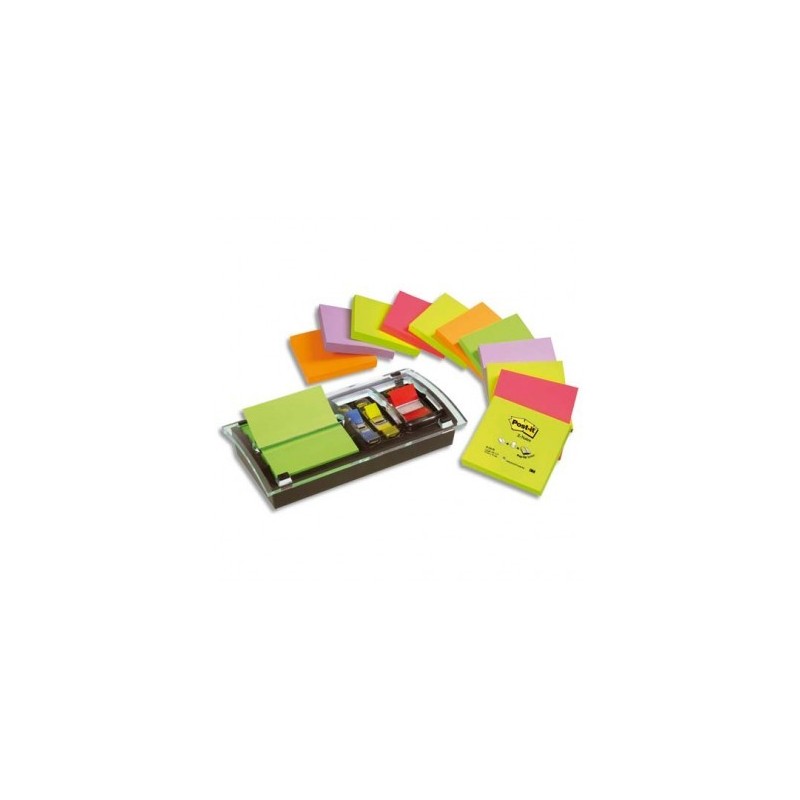 POST-IT support Millenium + 12 blocs Z-notes 7,6x7,6 cm coloris néon + 1 carte 10 index standard 2,54 cm