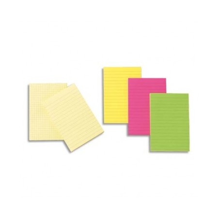 Bloc de 100 feuilles ligné néon. Dimensions : 10,2 x 15,2 cm. Coloris vifs assortis : 2 jaunes, 2 verts, 2 roses fluos. Lot de 6 blocs assortis. Prise de notes en réunion, séminaires...