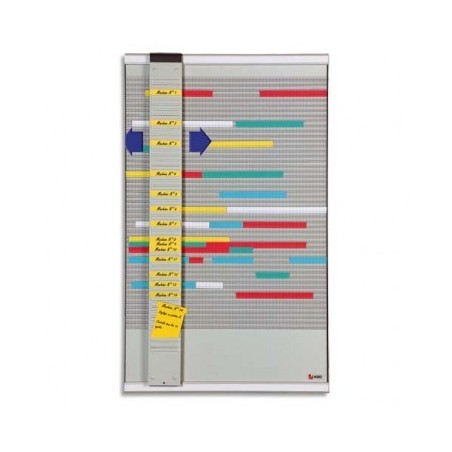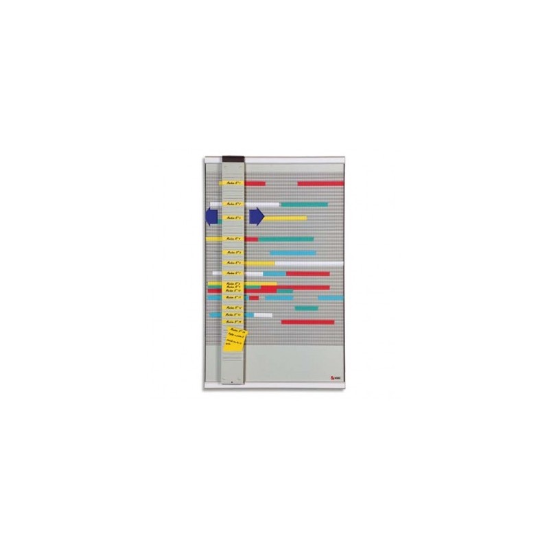 Idéal chaque fois qu’il est nécessaire de visualiser ou mesurer des durées ou quantités (par exemple pour suivre l’occupation des véhicules d’un parc auto. Dimensions (l x h) : 60 x 97 cm. Dans les gouttières transparentes à fixer sur le panneau quadrillé, se logent des bandelettes de couleur dont les longueurs sont proportionnelles à des durées, quantités, prévisions ou réalisations. Panneau quadrillé, impression gris anthracite, 54 lignes horizontales au pas de 15 mm et 60 verticales au pas de 10 mm. 1 bande index mobile pour 54 fiches T indice 3 (blanc) et 54 gouttières transparentes autocollantes (L 60 cm). Bandelettes de couleur à commander séparément. Gouttière adhésive de rechange.